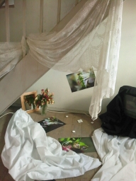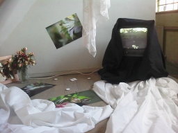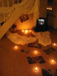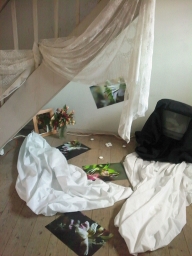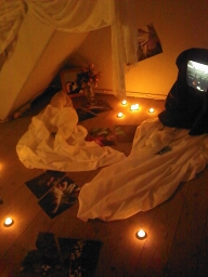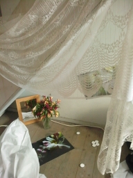 Photographs, Video, Fabric, Mirror, Flowers, Vase and Candles.